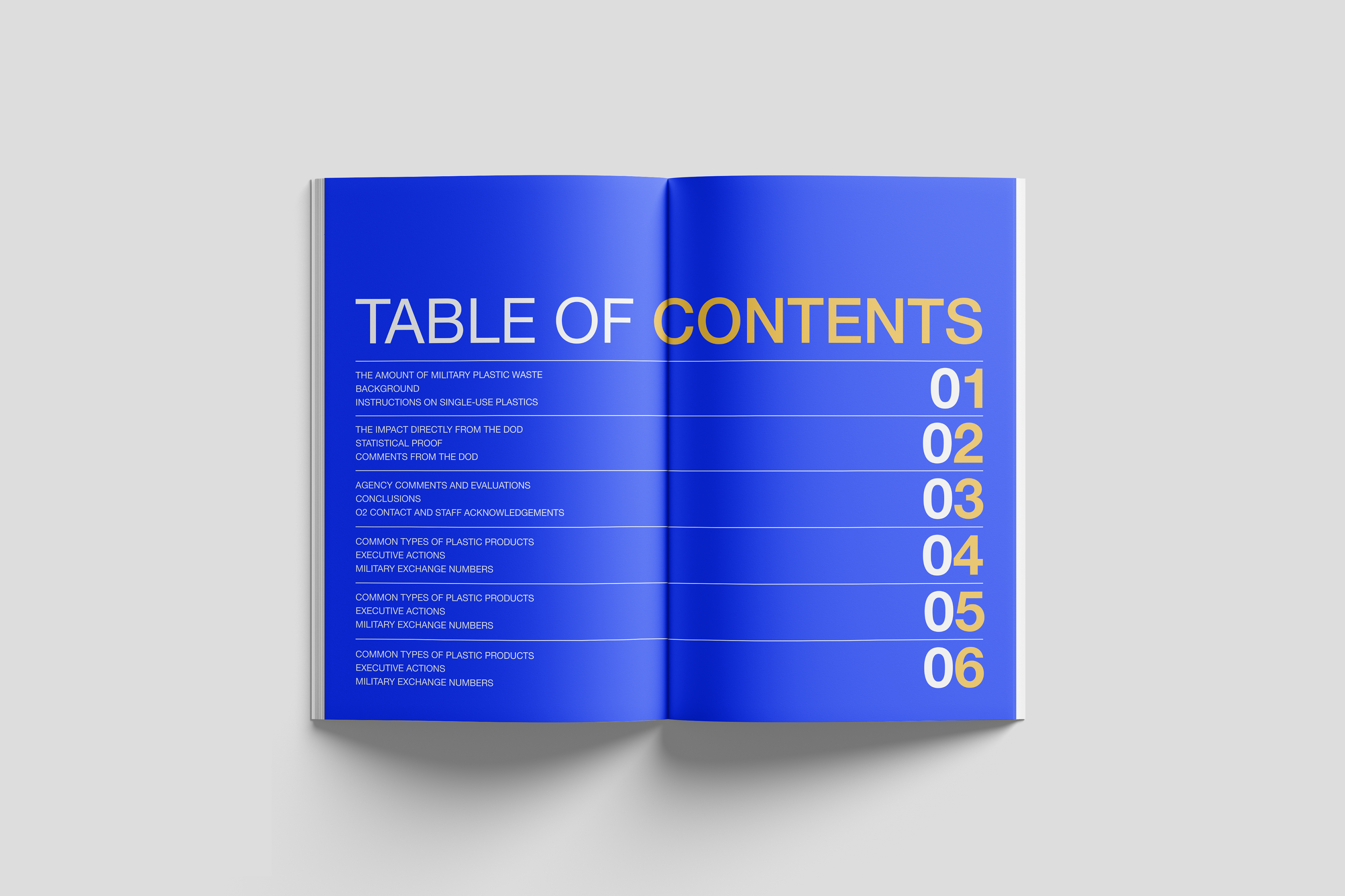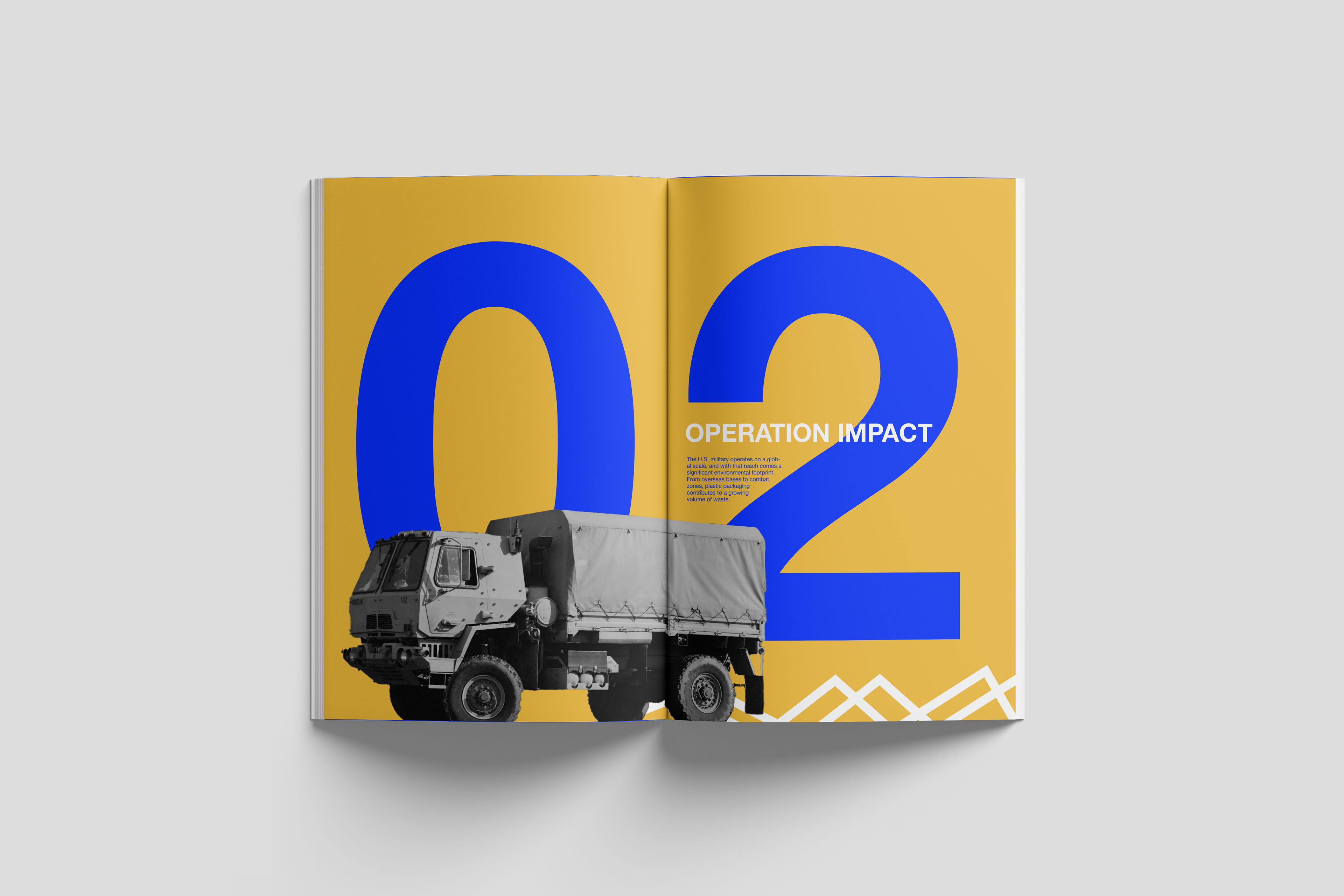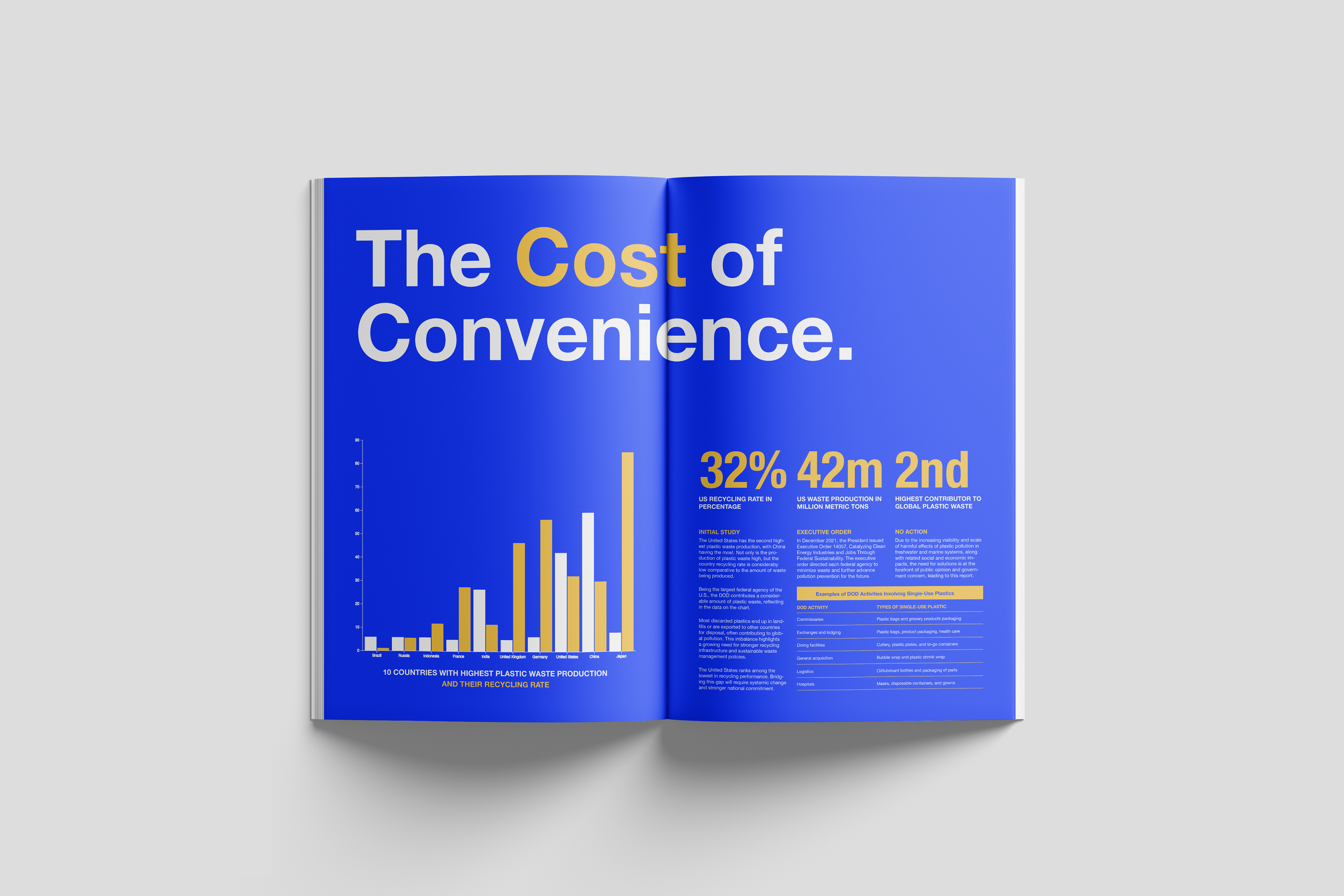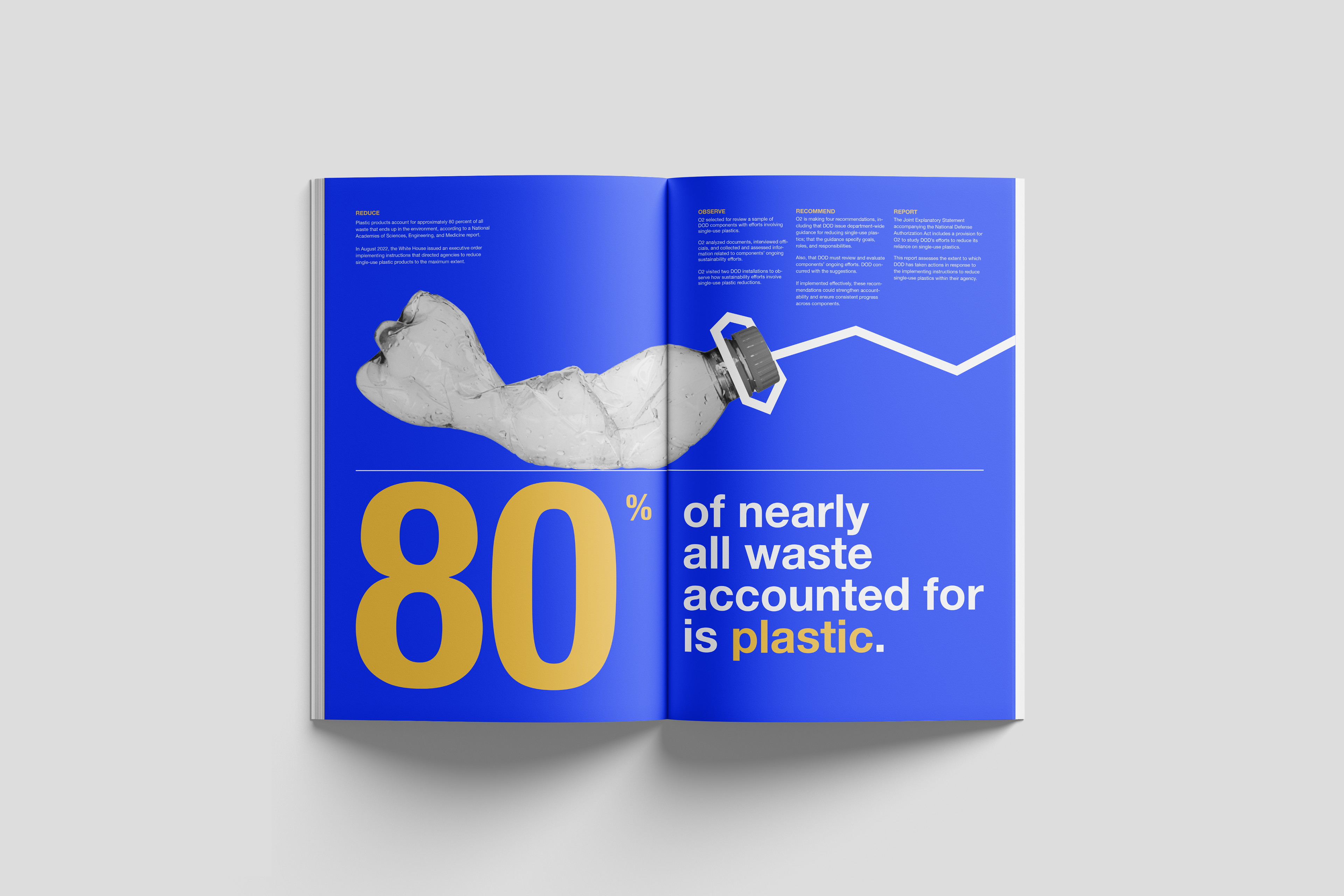 ABOUT This project reimagines the Government Accountability Office’s Annual Report by transforming it into O2, a refreshed, accessible, and visually engaging publication. Centered on a detailed investigation into single-use plastic waste within the U.S. military, the redesigned report highlights key findings, recommendations, and statistical insights related to sustainability practices.
