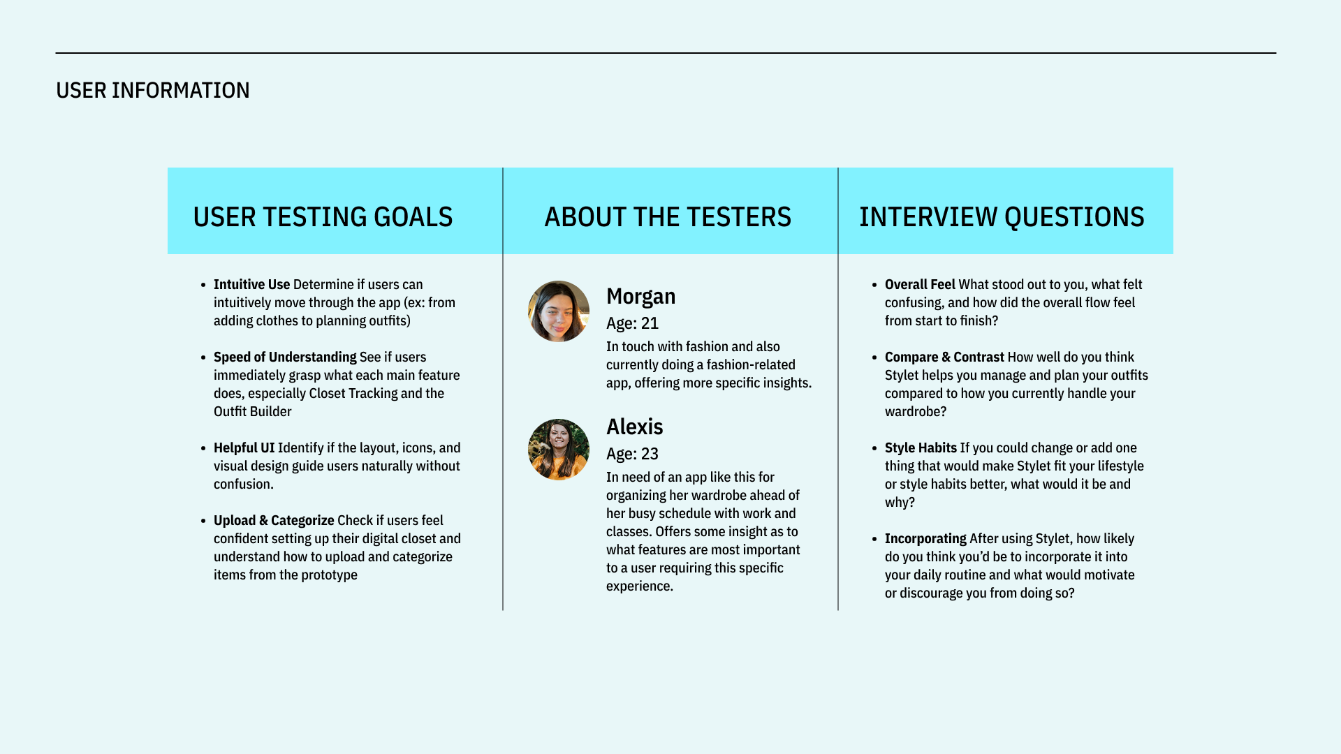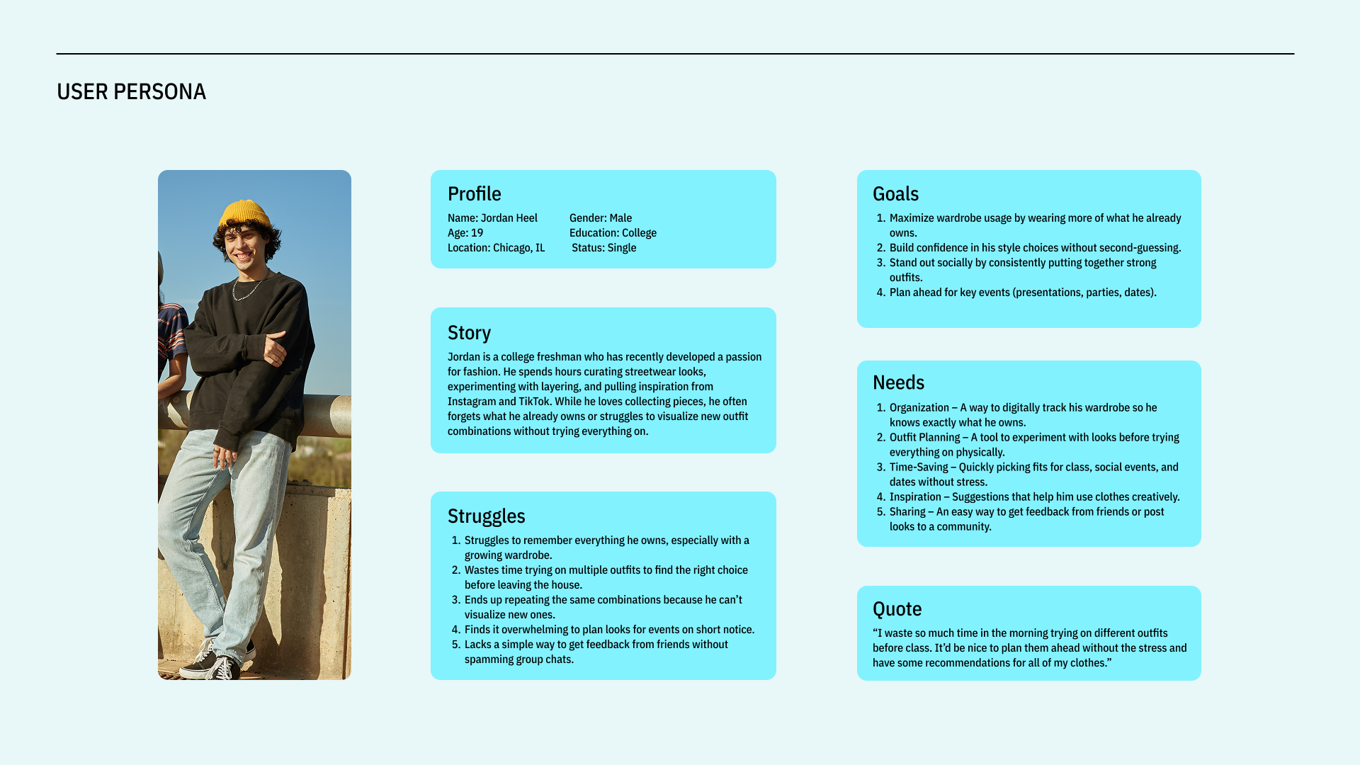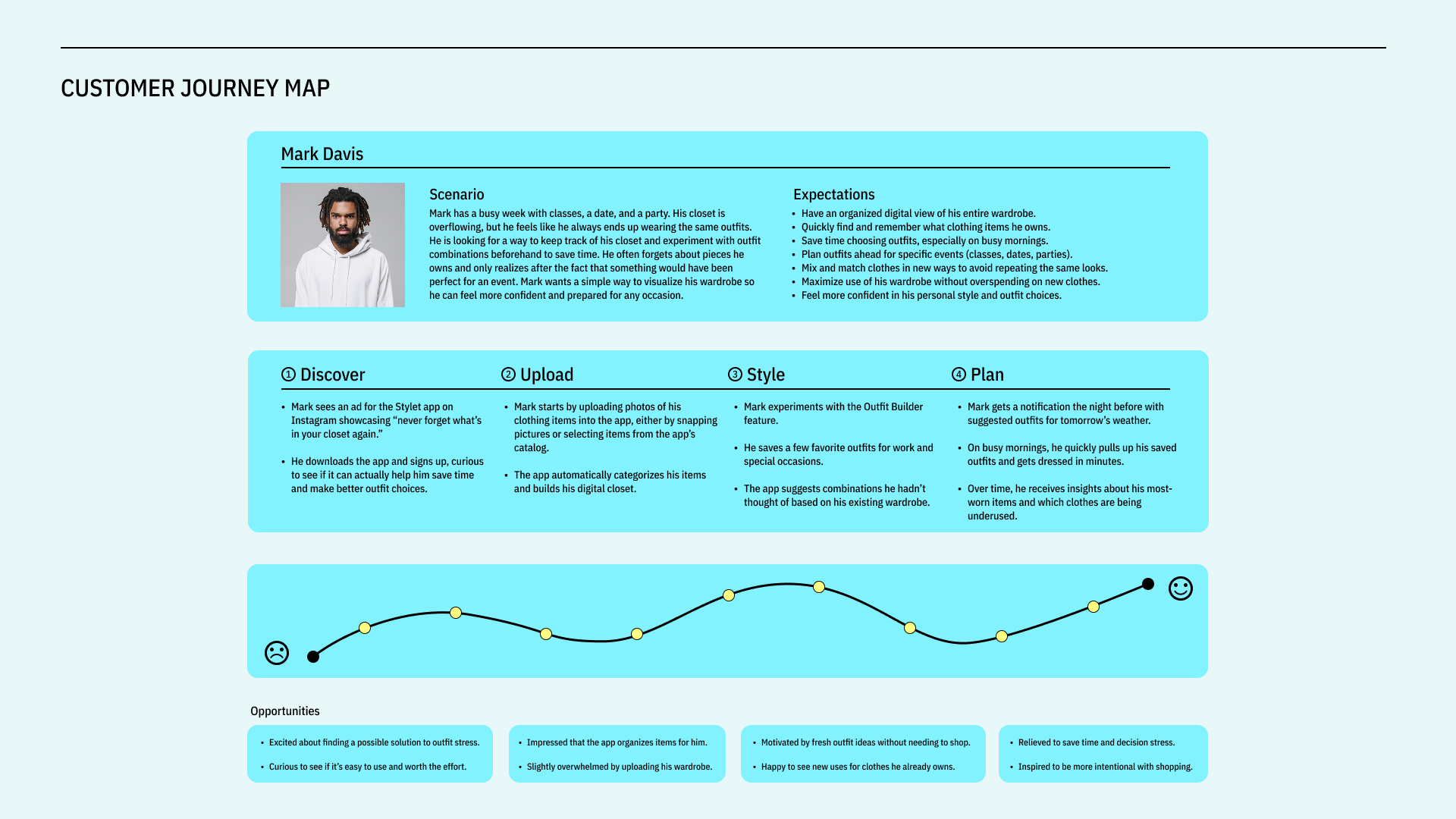 ABOUT Stylet is a digital wardrobe app designed to help users organize, build, and plan outfits with clarity and ease. The project addresses the common frustration of owning plenty of clothes but struggling to visualize cohesive outfits or remember what pieces work well together.