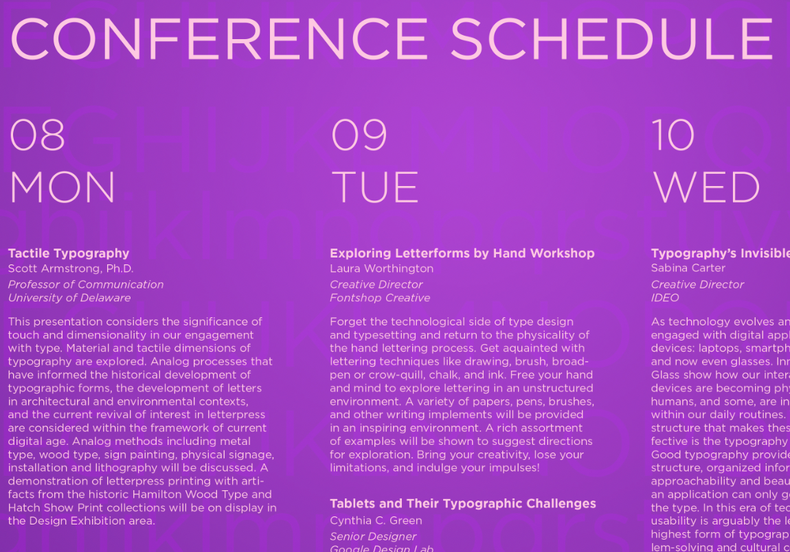 DESIGN Bold letterforms in varied scales overlap across the composition, forming texture and rhythm. A structured hierarchy distinguishes the conference name, date, and key information from the more experimental background. Limited colors keep the design clean while the type does the expressive work. The poster highlights typography as both communication and art form. Its layered, energetic forms speak directly to a typographic audience, celebrating type as material rather than just message.